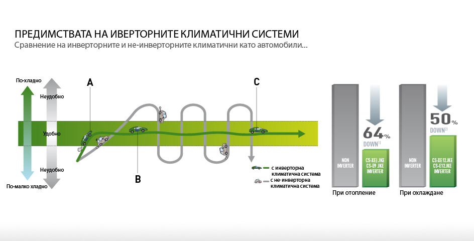 Сравнение на обикновените климатици и инверторите с автомобилите.